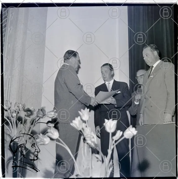 män, kostym, blommor, ceremoni, dokument, talare, podium, svartvitt, möte, presentation, kläder, affärsmän, bakgrund, publik, handskakning, ledare, evenemang, historia, 1900-tal, formell