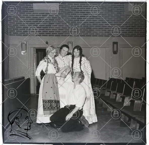 teater, scen, kostymer, traditionella kläder, kvinnor, man, auditorium, sittplatser, tegelvägg, belysning, grupp, föreställning, kultur, historisk, svartvit, interiör, samspel, dialog, skådespelare, uppträdande