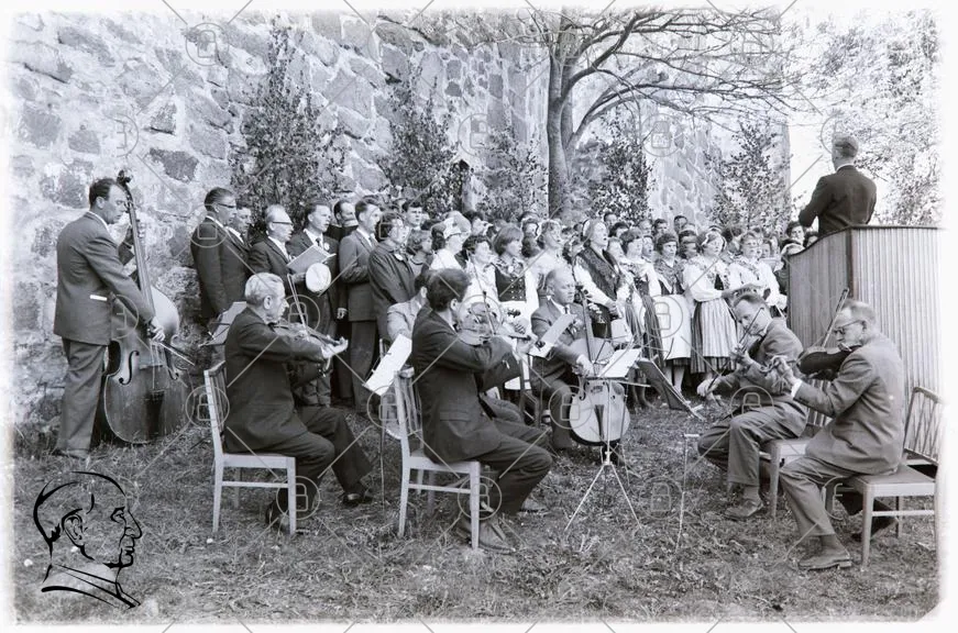musik, orkester, folkmusik, konserter, traditionell, kläder, violin, cello, sångare, gruppfoto, utomhus, svartvitt, historisk, samling, kultur, fest, spelmän, träd, vägg, sten, instrument, uppträdande, glädje, gemenskap, 1900-tal, festligheter, musikaliskt, artister, folkdans, evenemang