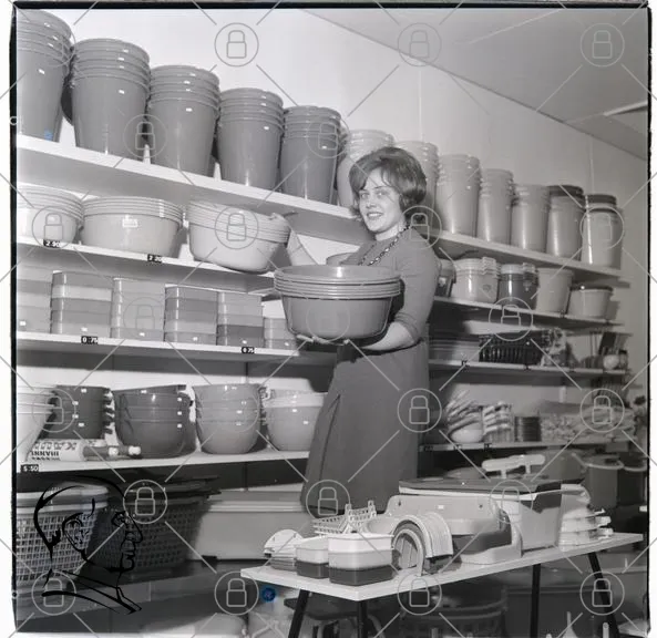 blomkrukor, hyllor, kvinna, butik, 1960-tal, plast, inredning, shopping, retro, hushållsartiklar, leksaker, färger, stil, mode, varor, försäljning, produkter, design, arrangemang, hem, trädgård, krukor, belysning, prydnad, vintage, kund, detaljhandel, utställning, sortiment, accessoarer