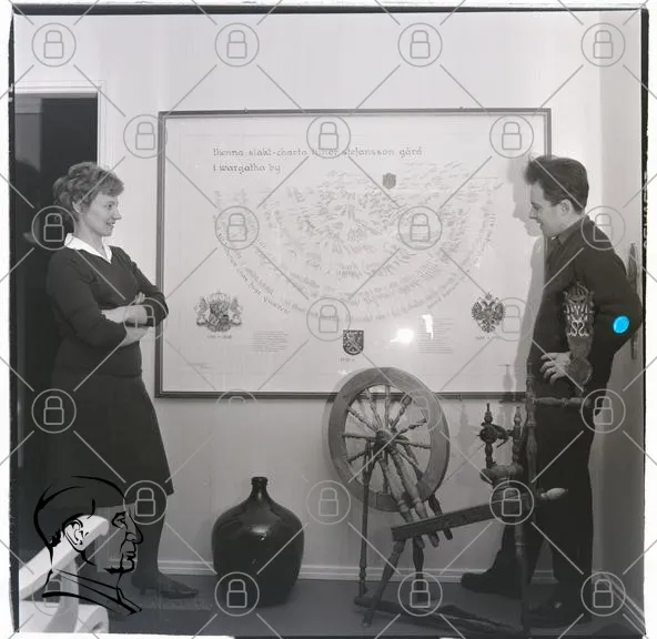 kvinna, man, vägg, tavla, släktträd, spinninghjul, keramik, inredning, svartvitt, 1900-tal, tradition, kultur, hem, porträtt, konst, historia, familj, samtal, kläder, möbler, detaljer, hantverk, konstverk, interiör, fotografi, vintage, nostalgi, skandinavisk, design, handarbete, folkliv