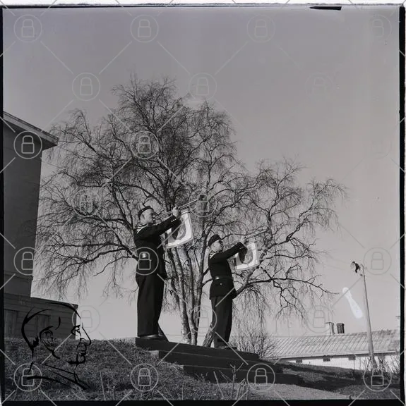 musiker, trumpet, uniform, träd, byggnad, svartvitt, utomhus, ceremoni, militär, blåsorkester, två personer, steg, landskap, tradition, musik, instrument, marsch, historisk, kultur, prestation, samling, uppträdande, ljud, festlig, kläder, stil, aktivitet, natur, bakgrund, scen