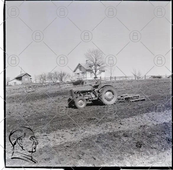 traktor, jordbruk, plöjning, landskap, gård, hus, träd, åker, svartvitt, maskin, fält, lantbruk, natur, rural, plöjningsredskap, landsbygden, odling, skörd, växtlighet, lantlig, traditionell, arbete, jord, plöjningsarbete, skog, fältarbete, väder, säsong, landskapsbild, gammal
