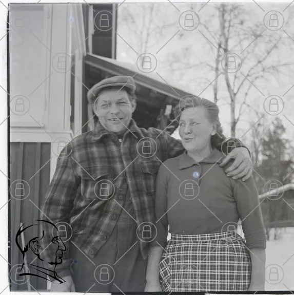 man, kvinna, leende, gammal bild, svartvitt, kläder, traditionell, landsbygd, familj, vänskap, natur, träbyggnad, 1900-tal, porträtt, gemenskap, glädje, kultur, historia, svensk, folkliv