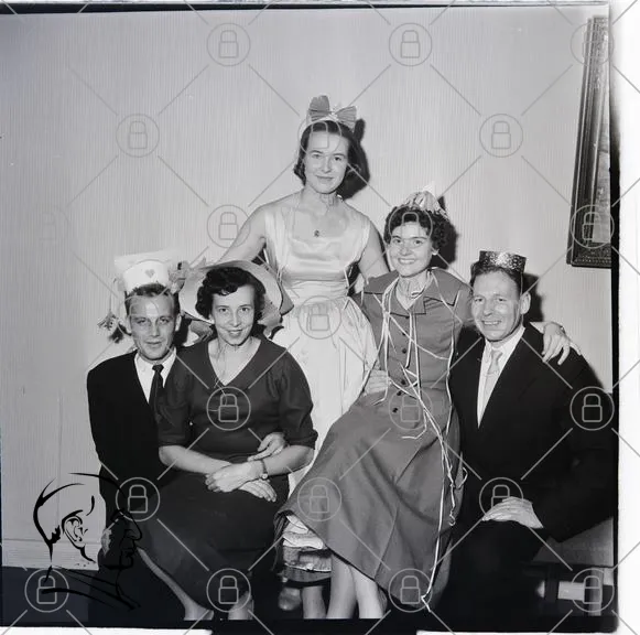 fest, kläder, 1950-tal, svartvitt, kvinnor, män, hattar, leenden, gruppfoto, eleganta, festligheter, sittande, stående, klänningar, kostymer, dekorationer, feststämning, retro, minnen, socialt, samvaro, glädje, tradition, firande, familj, vänner, nostalgi, stil, mode, fotografi