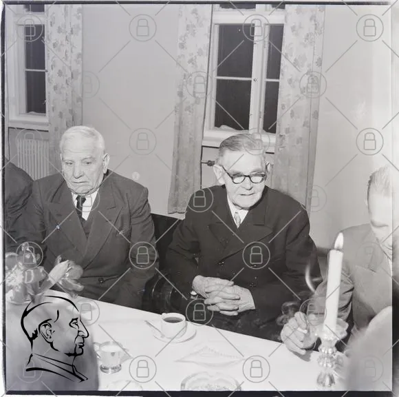 möte, män, bord, ljus, kaffe, samtal, kläder, 1900-tal, inomhus, fönster, duk, glas, blommor, stolar, tradition, diskussion, svartvitt, historia, samling, ansikten