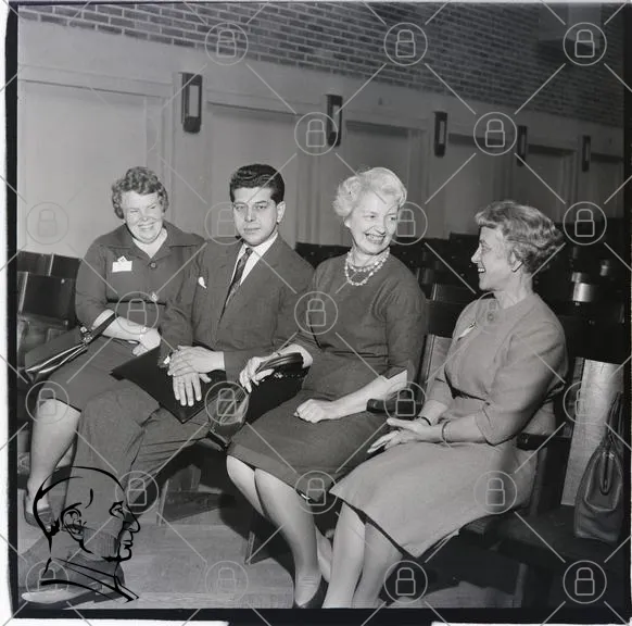 personer, kvinnor, män, sittande, leende, kläder, 1950-tal, inomhus, möte, publik, svartvitt, fotografi, stolar, interiör, socialt, samvaro, vänskap, diskussion, evenemang, retro, stil, ansikten, uttryck, gemenskap, tradition, historia, kultur, minnen, nostalgi, samling
