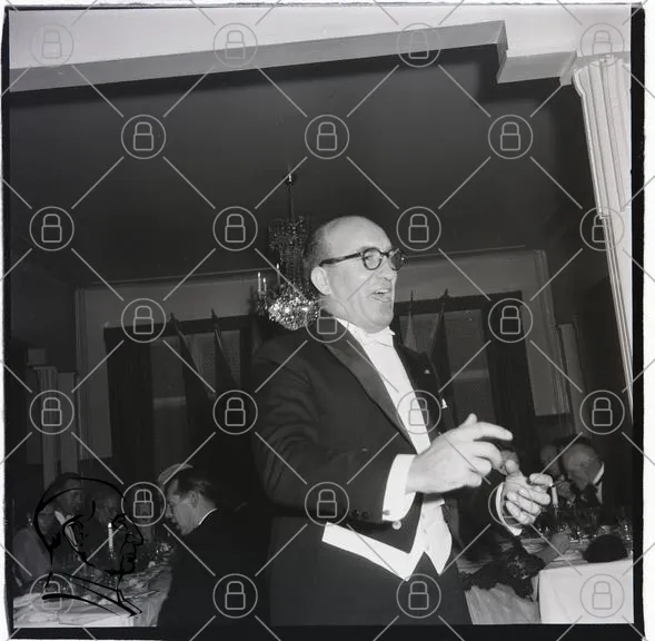 man, talare, fest, middag, svartvitt, kostym, glasögon, elegans, sällskap, bord, dekoration, flaggor, 1900-tal, socialt, evenemang, högtid, samling, diskussion, uttryck, gest, interiör, belysning, kläder, tradition, kultur, festligheter, gemenskap, stil, artighet, uppvaktning, nöje