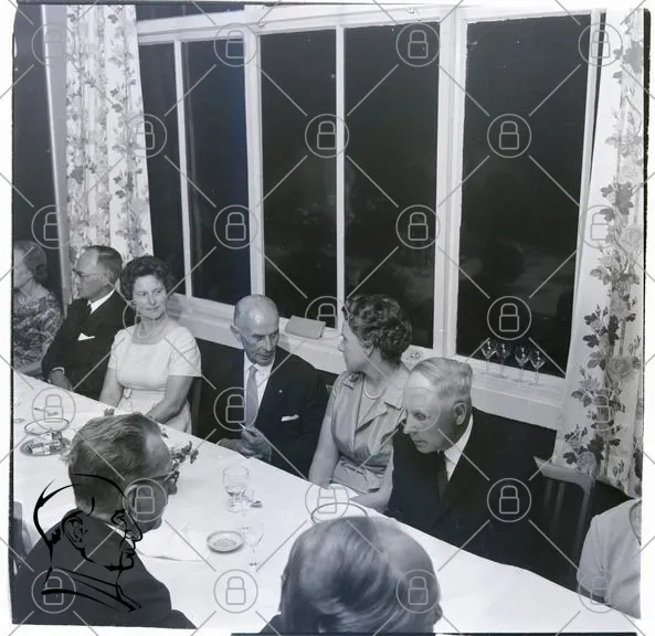 middag, fest, 1950-tal, kläder, bord, gäster, fönster, dukat, glas, blommor, män, kvinnor, samtal, svartvitt, socialt, samling, tradition, eleganta, leenden, interiör, stil, retro, familj, sällskap, middagssällskap, högtid, minnen, nostalgi, gemenskap