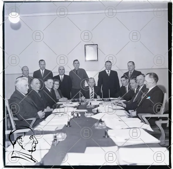 möte, män, kostym, bord, dokument, papper, glas, skrivbord, stolar, grupp, svartvitt, affärsmän, ledarskap, diskussion, formell, presentation, organisation, historia, 1900-tal, samarbete, beslut, professionell, kontor, traditionell, samling, ansikten, kläder, stil, inomhus