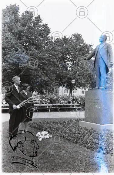 staty, Lenin, park, blommor, par, 1960-tal, monument, träd, klänning, kostym, minnesstund, historia, kultur, offentlig plats, fotografering, svartvitt, staty av Lenin, hyllning, människor, tradition