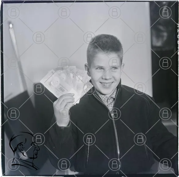 pojke, pengar, sedlar, leende, svartvitt, vintage, barn, inomhus, kläder, 1960-tal, glädje, fotografi, nostalgi, ungdom, ekonomi, lycklig, hand, porträtt, retro, minnen