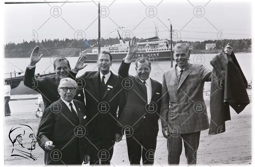 svartvit, grupp, män, hamn, båt, segling, linje, kläder, kostymer, hälsningar, 1960-tal, trä, träd, vatten, landskap, fotografi, nostalgi, vänskap, resor, historia
