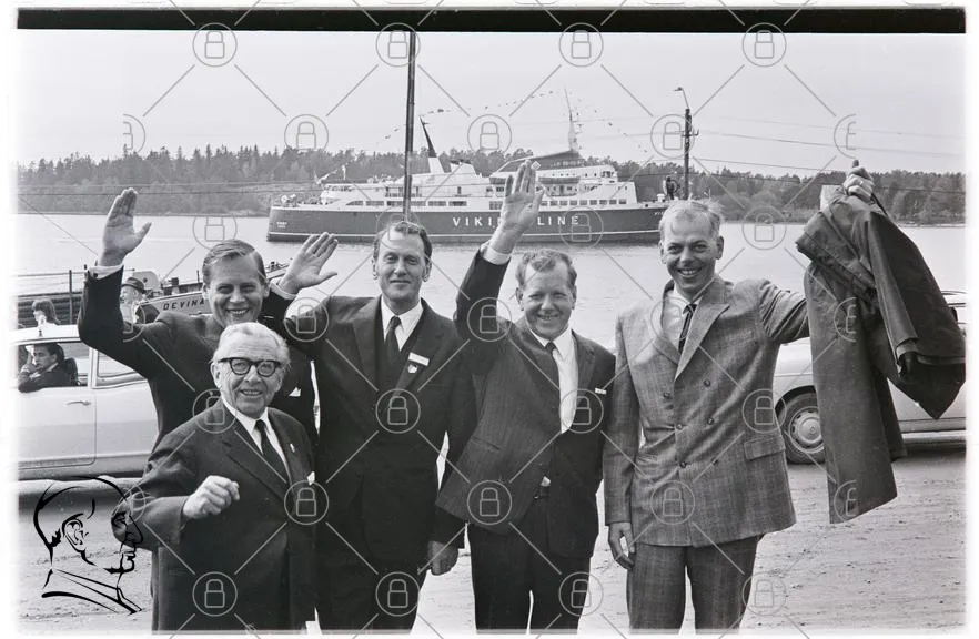 svartvit, grupp, män, handskakning, Viking Line, båt, hamn, kostymer, 1960-tal, leende, fotografering, sjöfart, tradition, vänskap, resor, skärgård, Sverige, Finland, fest, evenemang, historia
