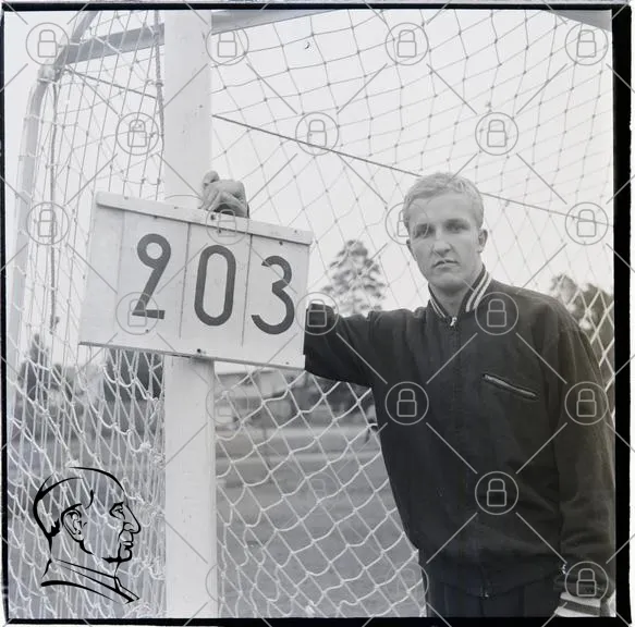 man, fotboll, mål, nummer, 203, svartvitt, sport, jacka, nät, utomhus, trä, gräs, 1960-tal, vintage, fotografi, idrott, pose, stående, arena, träning, ungdom, historisk, retro, manlig, ansikte, kroppsspråk, uttryck, fotbollsmål, nummerplåt, sportkläder