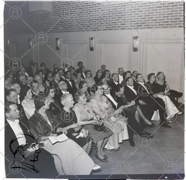 publik, evenemang, kläder, fest, svartvitt, sittande, män, kvinnor, 1950-tal, gala, samling, föreställning, eleganta, bänkar, inomhus, leenden, program, tradition, sällskap, klänningar, kostymer