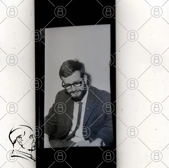 man, glasögon, skägg, kostym, slips, svartvitt, porträtt, 1960-tal, leende, sittande, inomhus, fotografi, retro, stil, intellektuell, akademisk, kläder, ansiktsuttryck, människa, person