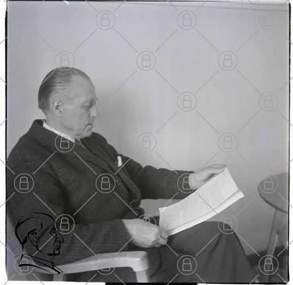 man, läsande, papper, stol, svartvitt, kläder, inomhus, fokus, eftertänksam, 1900-tal, dokument, ansiktsuttryck, stilla, intellektuell, gammal, traditionell, kontorsmiljö, tidning, text, kultur