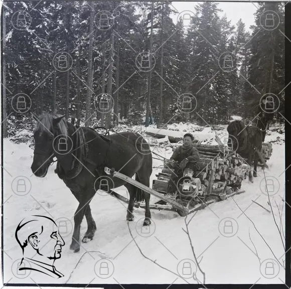 hästar, skog, snö, ved, timmer, vinter, pojke, släde, träd, natur, landskap, arbete, tradition, svartvitt, hästskötare, skogsarbete, friluftsliv, last, ekipage, historisk, rural, lugn, stillhet, vinterlandskap, skogsbruk, häst, transport, avverkning, skogsarbetare, gammal