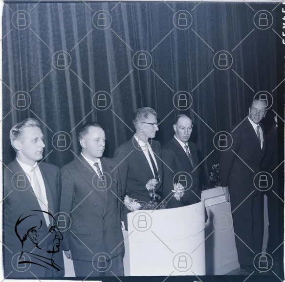 män, kostymer, blommor, podium, svartvitt, evenemang, talare, 1960-tal, formella kläder, bakgrund, scen, grupp, konferens, presentation, affärsmän, stil, professionell, samling, högtidlig, män i kostym