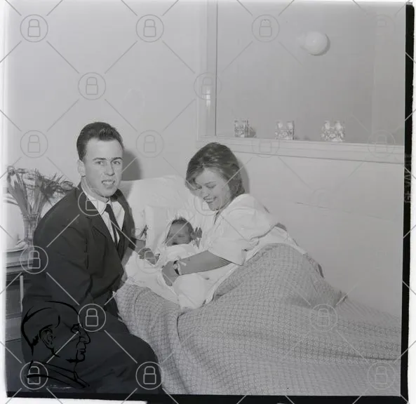 man, kvinna, baby, familj, porträtt, inomhus, säng, kläder, 1950-tal, svartvitt, leende, möbler, hem, kärlek, föräldrar, barn, nyfödd, vård, trygghet, glädje, relation, minne, tradition, samvaro, interiör, dekoration, växter, ljus, fotografi