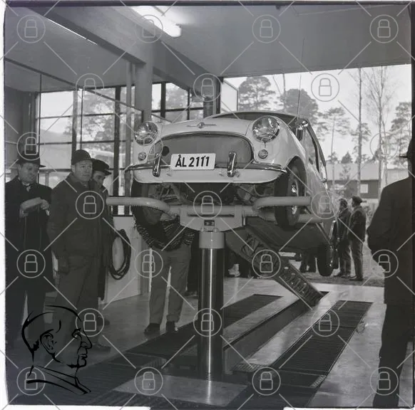 bil, verkstad, lyft, 1960-tal, mekaniker, män, svartvitt, registreringsskylt, AL 2111, garage, teknik, inspektion, fordon, arbete, maskin, retro, klassisk, bildel, service, underhåll, publik, stående, plattform, lyftsystem, bilar, industri, miljö, historisk, traditionell, motor