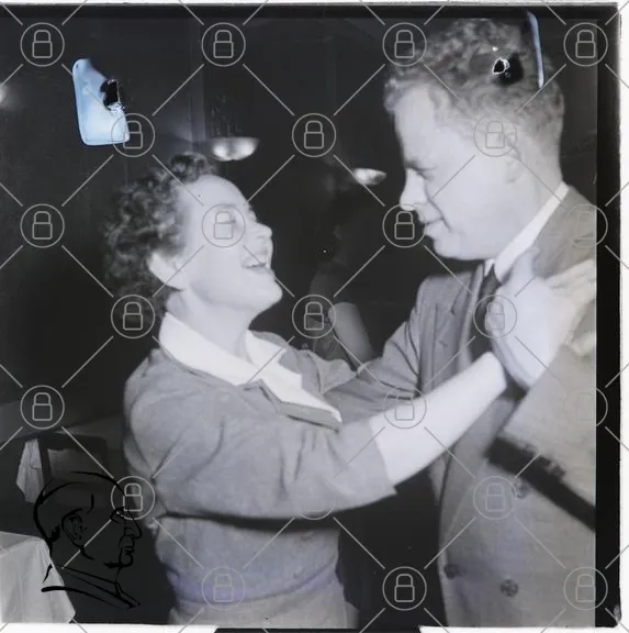 dans, par, kvinna, man, leende, fest, 1950-tal, kläder, inomhus, restaurang, socialt, interaktion, glädje, svartvitt, retro, vintage, sällskap, musik, stämning, elegans, tradition