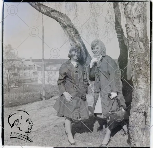 två kvinnor, träd, klänningar, 1960-tal, svartvitt, mode, leende, utomhus, park, handväska, vintage, fotografi, landskap, stil, vänskap, ungdom, kläder, natur, bakgrund, gräs
