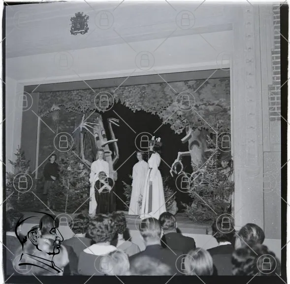 scen, teater, publik, skog, träd, kostymer, föreställning, svartvitt, människor, lucia, ljus, tradition, vinter, dekorationer, teaterpjäs, åskådare, scenkonst, kultur, evenemang, uppträdande