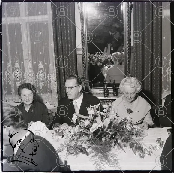 middag, fest, bord, blommor, glas, kvinnor, män, spegel, dukning, 1900-tal, kläder, leenden, samtal, dekoration, sällskap, svartvitt, tradition, elegans, socialt, samvaro