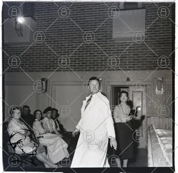 man, vit rock, publik, kvinnor, män, inomhus, sittande, stående, vägg, lampor, dörr, hatt, klänningar, kostym, slips, svartvit, teater, föreställning, åskådare, scen