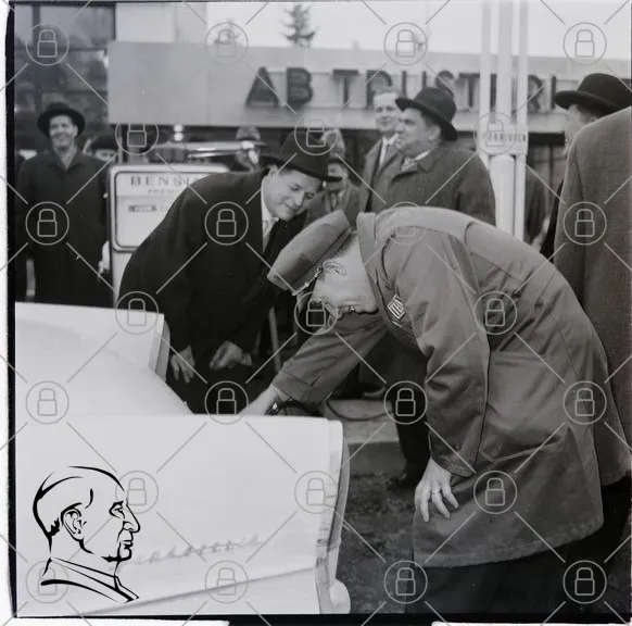 män, kostymer, hattar, bilar, 1950-tal, AB Truster, bensinstation, samling, diskussion, svartvitt, historisk, utomhus, affärsmän, reklam, bilar, motorfordon, vintage, socialt, evenemang, män i hatt, kläder, stil, nostalgi, grupp, interaktion, ansikten, stämning, miljö, företag