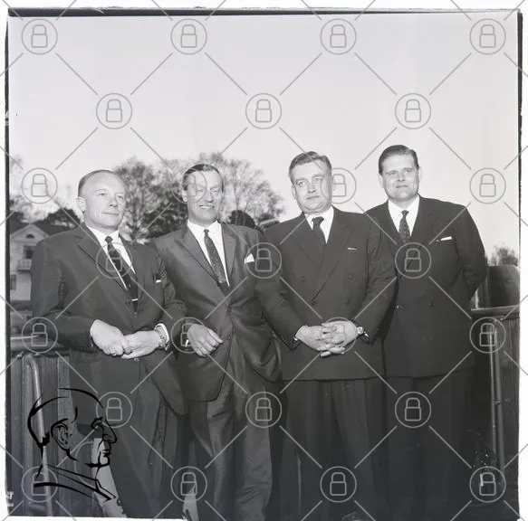 fyra män, kostymer, svartvitt, porträtt, affärsmän, 1960-tal, formell klädsel, gruppfoto, utomhus, träd, byggnader, stil, professionell, leende, män i kostym, vintage, klassisk, socialt sammanhang, samarbete, representation