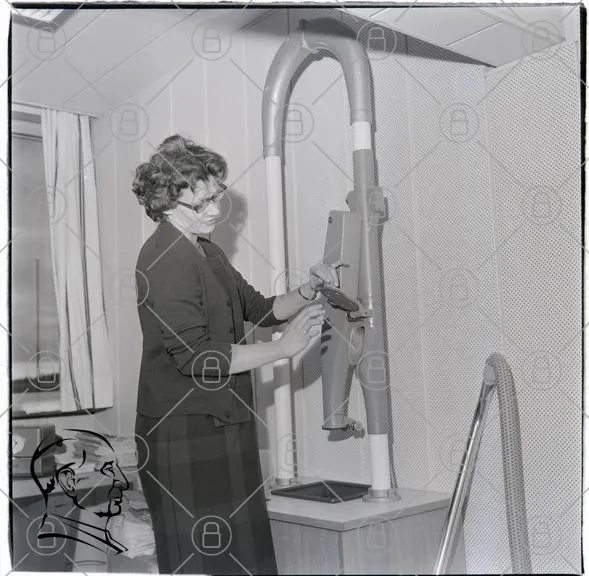 kvinna, kontor, maskin, teknik, 1950-tal, svartvitt, arbete, utrustning, rör, hand, kontorsmiljö, kläder, skåp, fönster, golv, modern, design, funktion, innovation, forskning, experiment, laboratorie, verktyg, apparat, manuell, mekanism, stil, retro, vintage, professionell