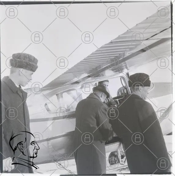 flygplan, män, vinter, hattar, snö, teknik, arbete, 1950-tal, kläder, utomhus, motor, flygning, historisk, svartvitt, landskap, samarbete, mekaniker, flygplats, fordon, transport