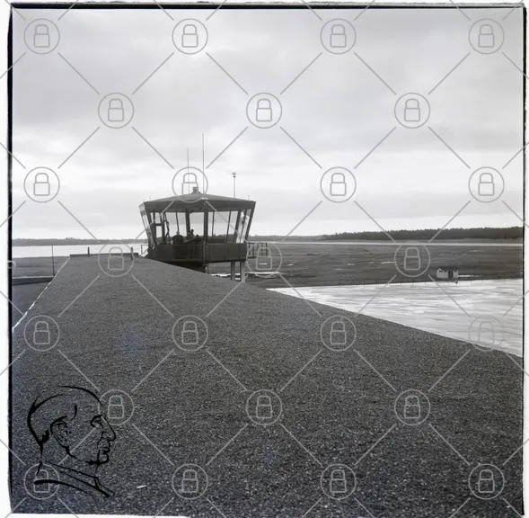 flygplats, kontrolltorn, landning, flyg, plattform, vatten, horisont, grå himmel, byggnad, väg, struktur, transport, säkerhet, utsikt, landskap, teknik, kommunikation, navigering, infrastruktur, avstånd, stillhet, natur, svartvit, fotografering, panoramavy, flygtrafik, observation, modern, funktionell, design