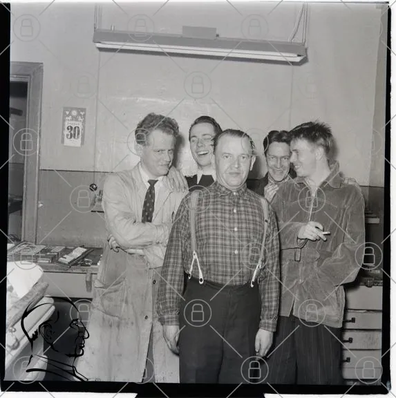 män, leende, kläder, 1950-tal, svartvitt, grupp, inomhus, arbete, fotografi, retro, kostymer, interiör, skratt, traditionell, stil, mänskliga relationer, arbetsplats, nostalgi, gammal, historia