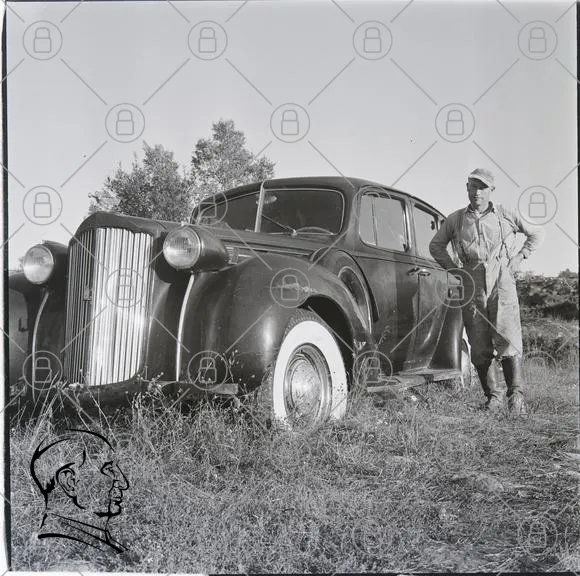 bil, gammal, svartvit, man, landskap, gräs, träd, vintage, fordon, 1940-tal, stående, hatt, stövlar, klassisk, motor, parkera, landsbygd, fotografering, nostalgi, retro, mekanik, teknik, historia, transport, utomhus, natur, tradition, stil, detaljer, skugga