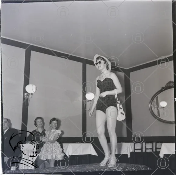 modell, catwalk, mode, 1950-tal, badkläder, svartvitt, fotografi, kvinna, hatt, skor, publik, restaurang, vintage, stil, glamour, modevisning, klänning, retro, smycken, leende, scen