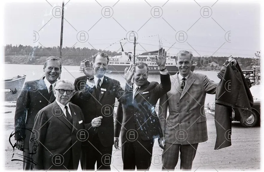 grupp, män, kostymer, svartvitt, hamn, båt, hälsning, 1960-tal, porträtt, affärsmän, landskap, träd, vatten, fotografi, historiskt, samarbete, evenemang, möte, vänskap, tradition, stil, kläder, ansikten, leenden, bakgrund, skärgård, transport, kommunikation, teknik