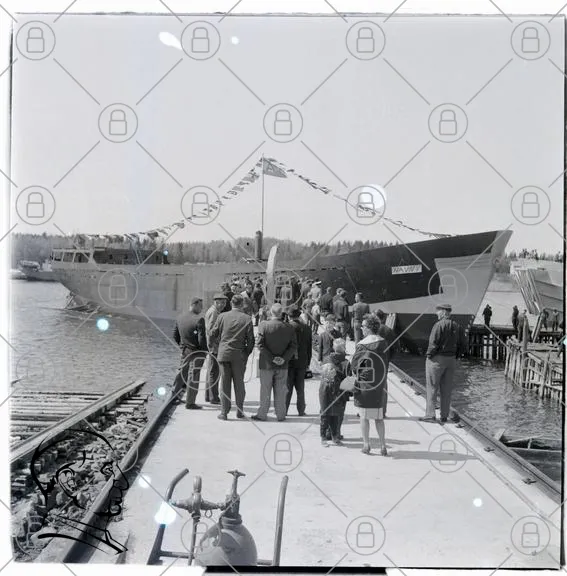 båt, hamn, människor, flaggor, ceremoni, brygga, vatten, 1950-tal, fest, samling, kläder, trä, byggnad, fotografering, tradition, skärgård, båtbygge, historia, marin, sällskap, jubel, festligheter, landskap, svartvitt, gammal, kultur, evenemang, båtlansering, folk, båtliv