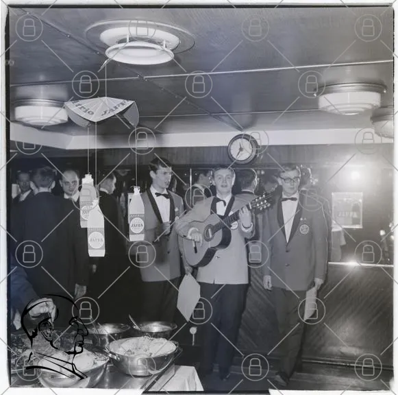 fest, musik, gitarr, män, kostymer, mat, buffé, 1950-tal, klocka, sång, socialt, evenemang, underhållning, restaurang, kläder, stämning, samvaro, dekoration, bord, servetter