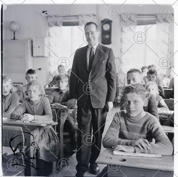 klassrum, elever, lärare, 1950-tal, svartvitt, skolbänkar, pojkar, flickor, undervisning, retro, utbildning, barn, skrivbord, fönster, klocka, glob, kläder, stil, ansiktsuttryck, koncentration, traditionell