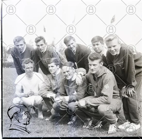 fotboll, lag, spelare, svartvitt, sport, utomhus, träning, ungdomar, 1960-tal, kläder, leende, gruppbild, gräs, flaggor, motion, gemenskap, tävling, idrott, pojkar, tradition, nostalgi, samarbete, prestation, glädje, vänskap, minnen