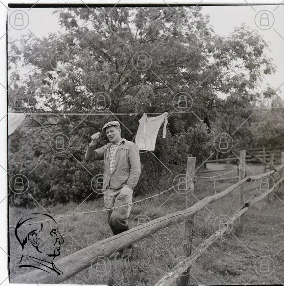 man, kläder, tvätt, linor, natur, träd, staket, svartvitt, landskap, gammaldags, bondgård, sommar, utomhus, traditionell, rural, fotografi, skratt, arbete, fritid, enkelhet
