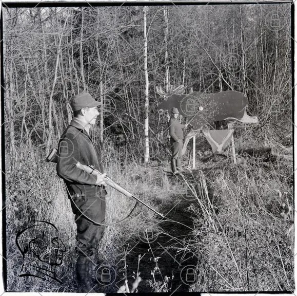jakt, älg, skog, män, gevär, mål, träning, natur, vapen, jaktkläder, fotografi, svartvitt, utomhus, jaktövning, älgfigur, jaktkompisar, höst, landskap, vildmark, tradition