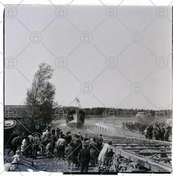 båt, människor, trä, vatten, fabrik, byggnad, träd, skog, ceremoni, historisk, svartvit, lansering, publik, arbete, industri, transport, teknik, 1900-tal, samling, landskap
