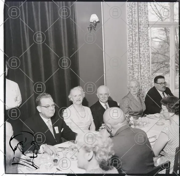 middag, fest, 1950-tal, klädda, bord, mat, dryck, sällskap, leenden, eleganta, inredning, fönster, dukat, glas, män, kvinnor, svartvitt, traditionell, samvaro, högtidlig, samtal, skratt, belysning, klänningar, kostymer, socialt, minnen, familj, vänner, festligheter