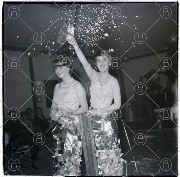 fest, kvinnor, glitter, kläder, 1960-tal, dans, festligheter, dekorationer, glädje, masker, retro, svartvitt, feststämning, tärnor, firande, sällskap, festlokal, skratt, tradition, festkläder, festlig, jubel, festligheter, festlig outfit, festlig dekoration, glittrande, festlig stämning, festlig aktivitet, festlig dans, festlig miljö