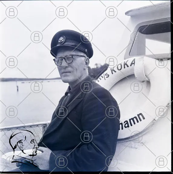 man, sjöman, båt, livboj, kapten, glasögon, svartvitt, hamn, sjöfart, kläder, hatt, stilla vatten, fotografi, 1900-tal, svensk, tradition, maritim, historia, yrke, landskap, natur